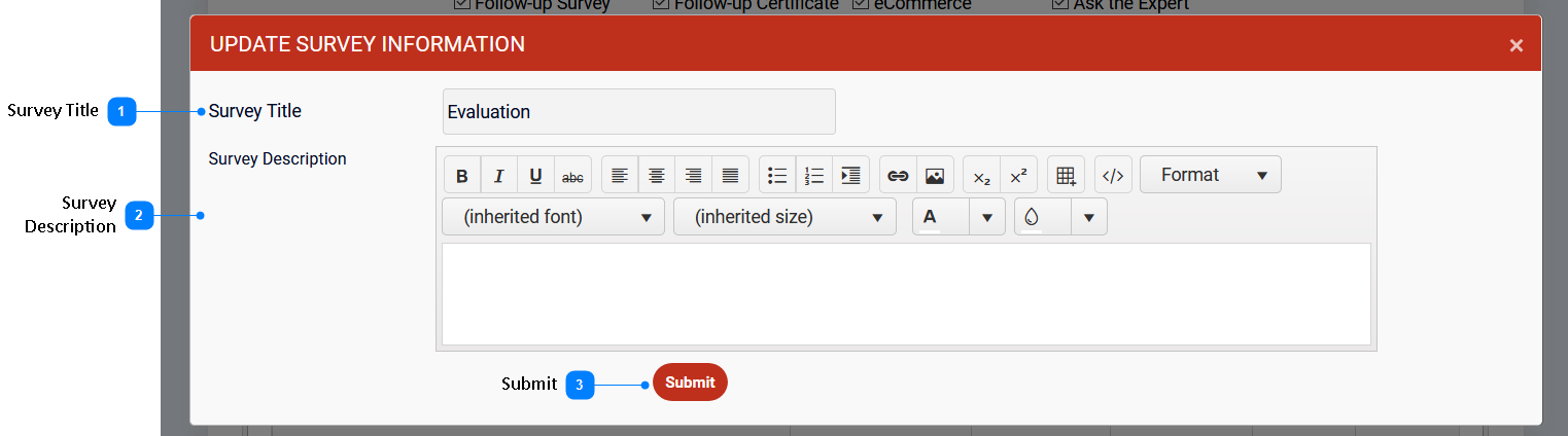 Enter the required information for Survey Title and Survey Description and click Submit button to save.