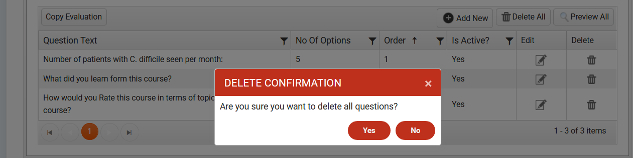 Click Delete All button to delete all evaluation questions. System displays a warning message before deleting the question(s) as shown below.