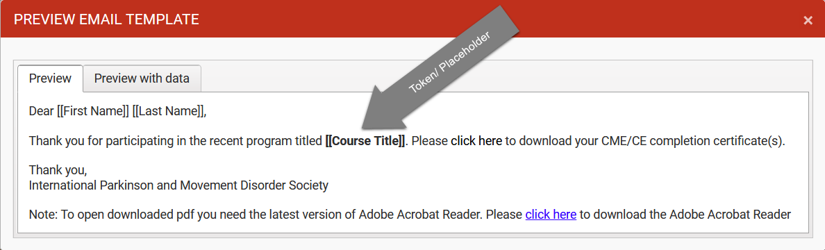 The Preview Email Template interface having two tabs i.e. Preview and Preview with data. The Preview tab shows Email text with tokens or placeholders which will be replaced with actual values when emails are sent. Example tokens are like First Name, Last Name, Course Title, etc. enclosed with opening "[[" and closing square brackets "]]".
