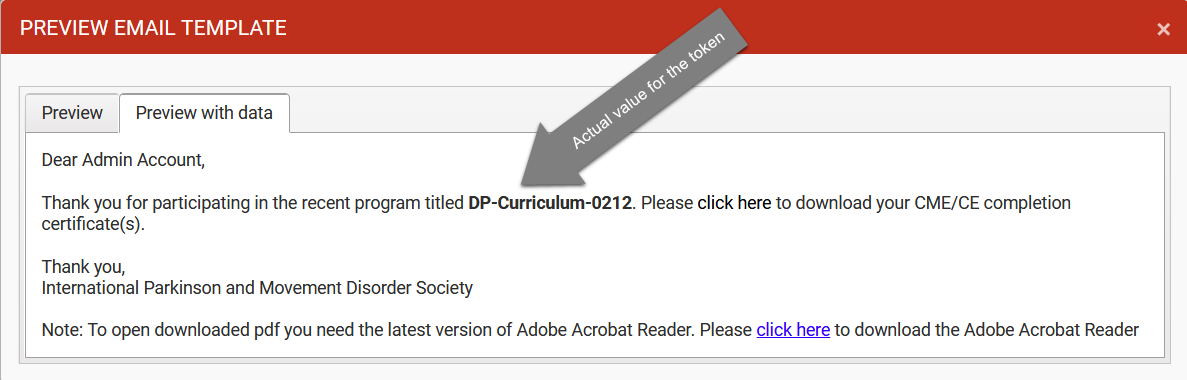 The Preview with data tab shows how the Email will look like with actual data replacing tokens.