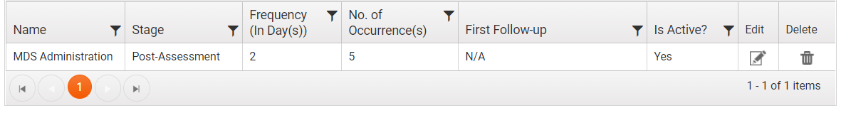 The grid shows Email settings like template name, stage (event), frequency in no. days reminder needs to be re-sent, how many reminders need to be sent, when shall the first follow-up reminder Email to be sent, mark the reminder active or inactive, edit and delete Email reminder.