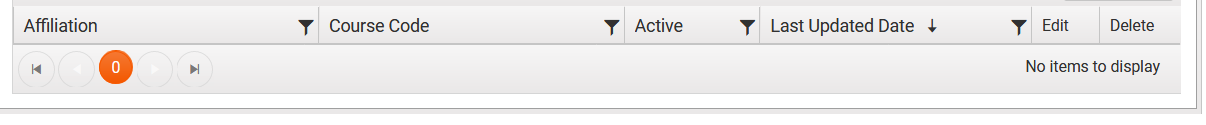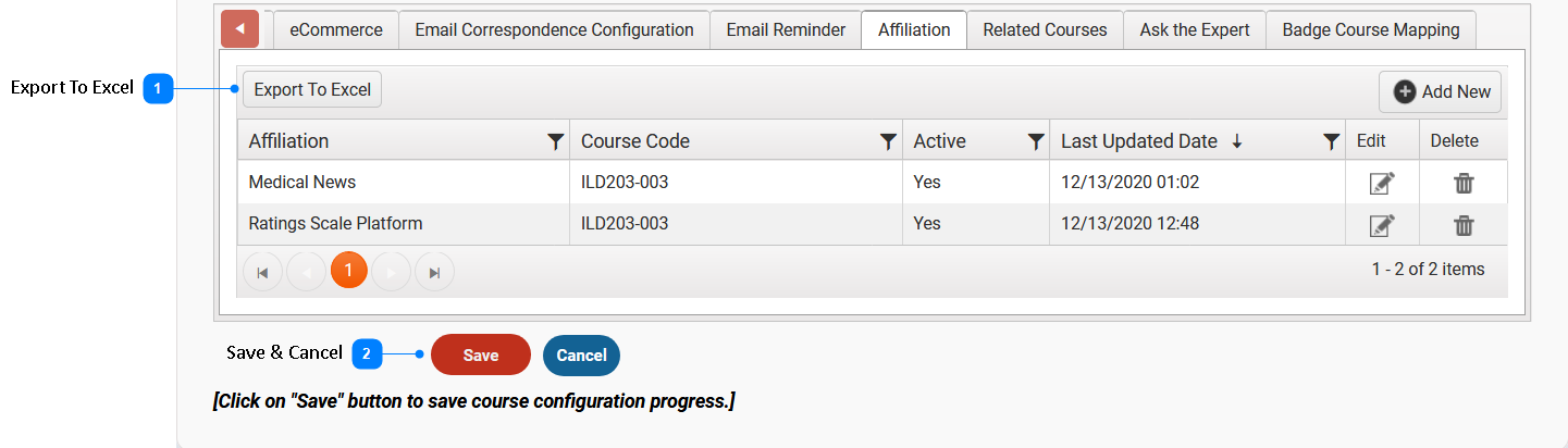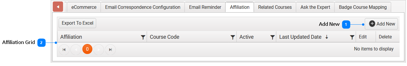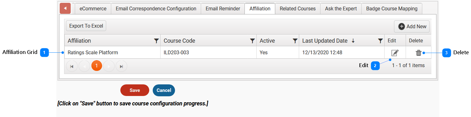 This feature allows administrative user to associate affiliation from existing affiliations available/defined in the system to the currently selected course. The Add New option is available on top right part of Affiliation grid.