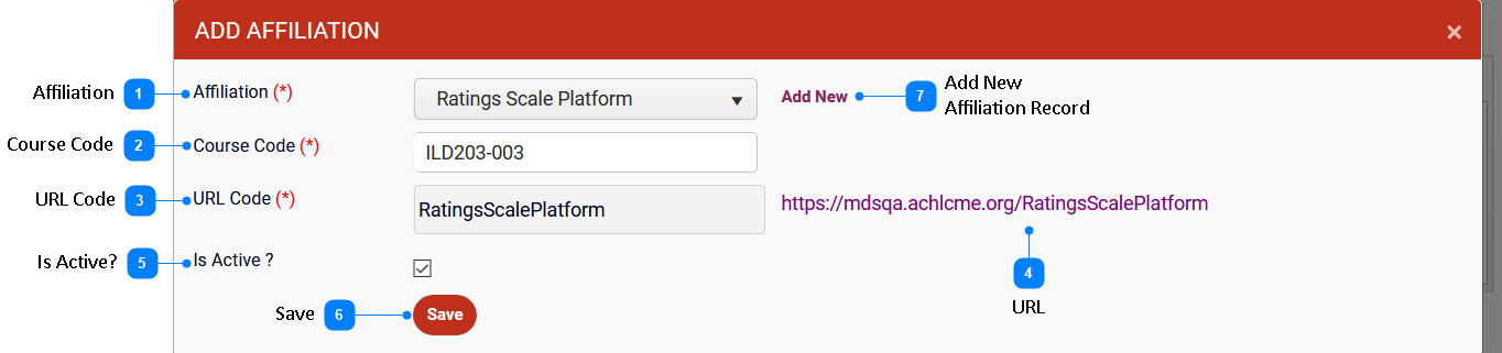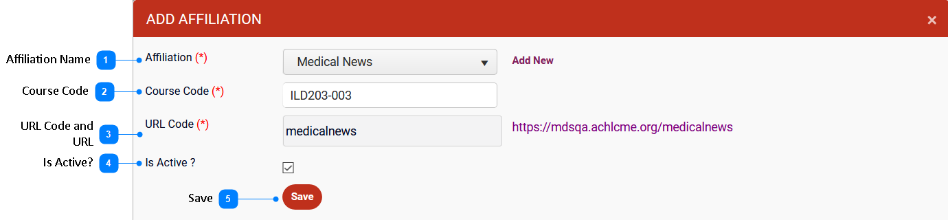 System displays an interface which displays Course Code, URL Code, URL and Is Active? data fields. The saved affiliation record is shown as selected.