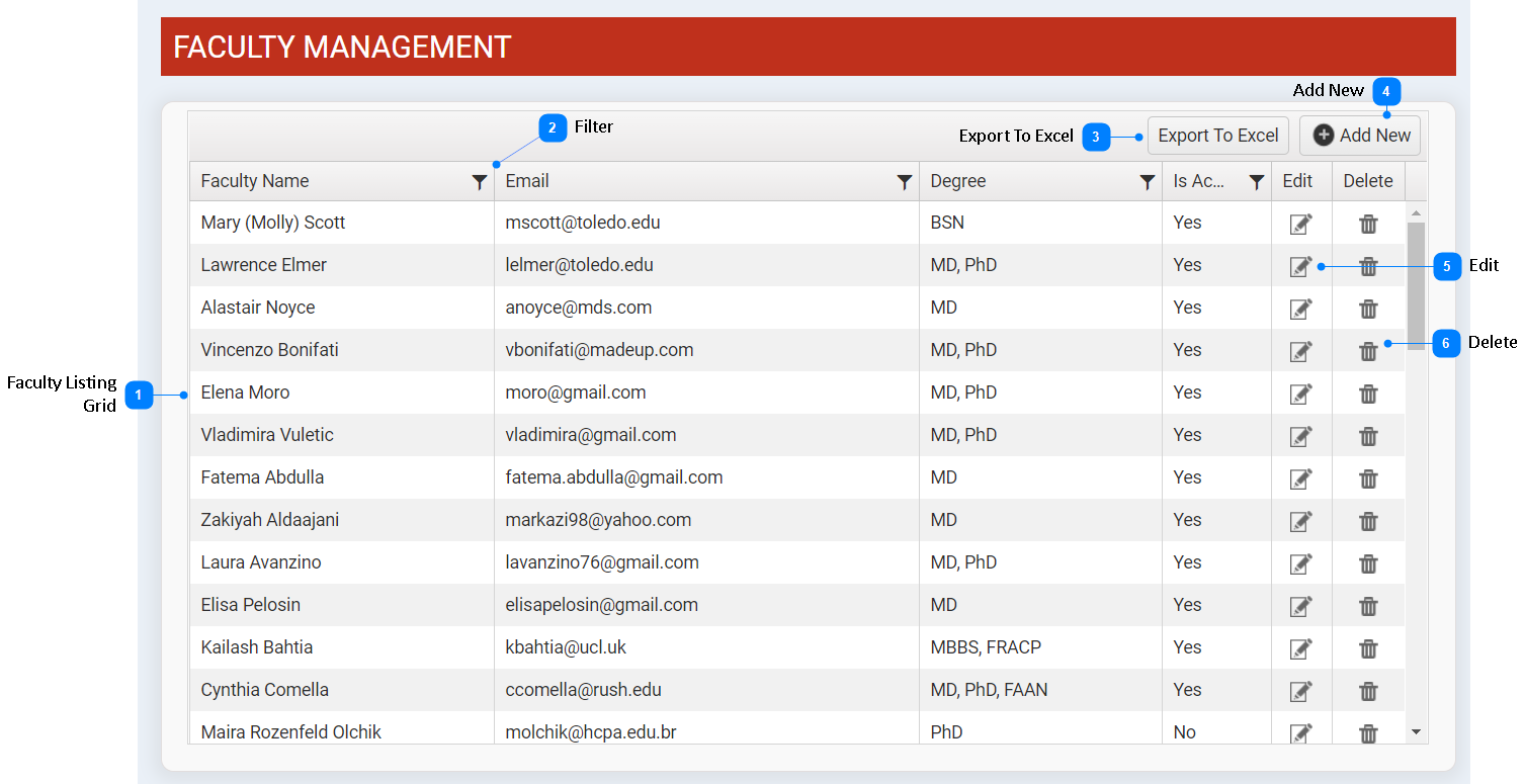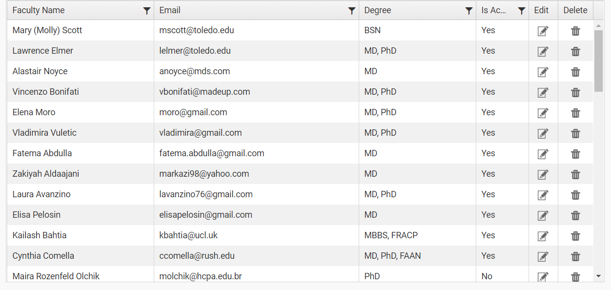 Faculty listing grid lists faculty member. It displays data like, Faculty Name, Email, Degree, Active status, etc.