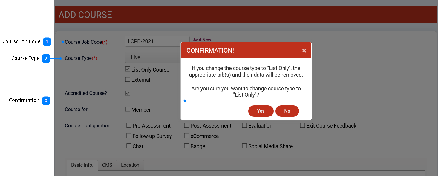 Basic Info. and the CMS configuration options are common for all course types except external courses.