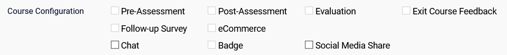 There are certain configuration settings involved for setting up the course. These configuration settings are grouped into different tabs based on course type. For example, Pre-Assessment, Post-Assessment, eCommerce, Badge, etc.