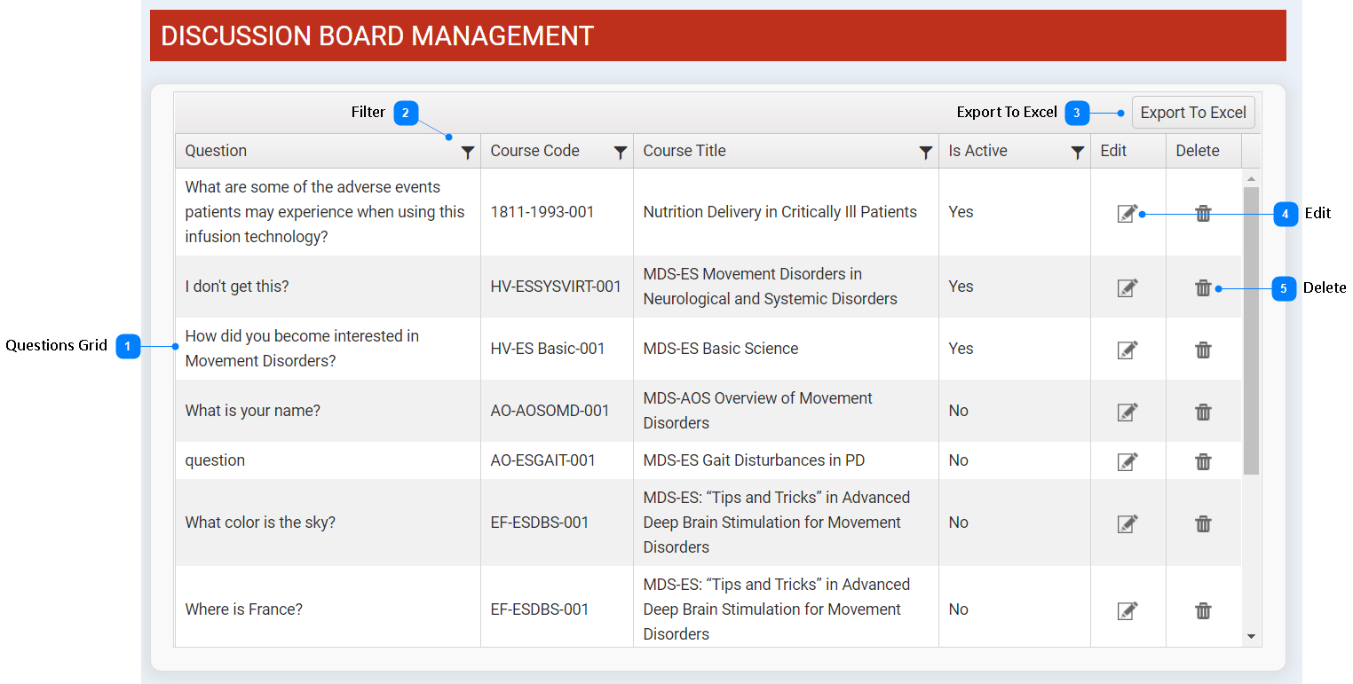 Click Delete button to remove question from the discussion board.