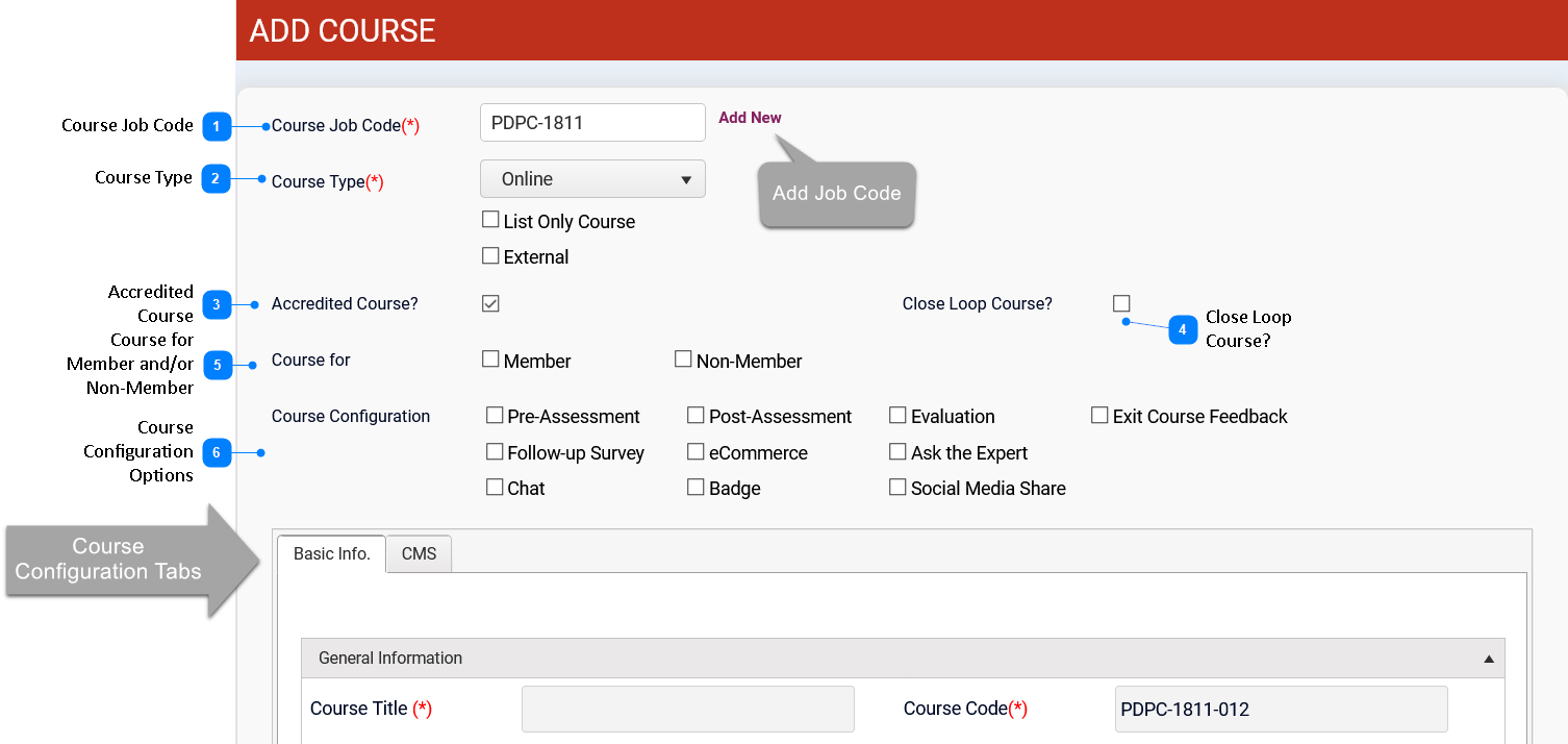 Basic Info. and the CMS configuration options are common for all course types except external courses.