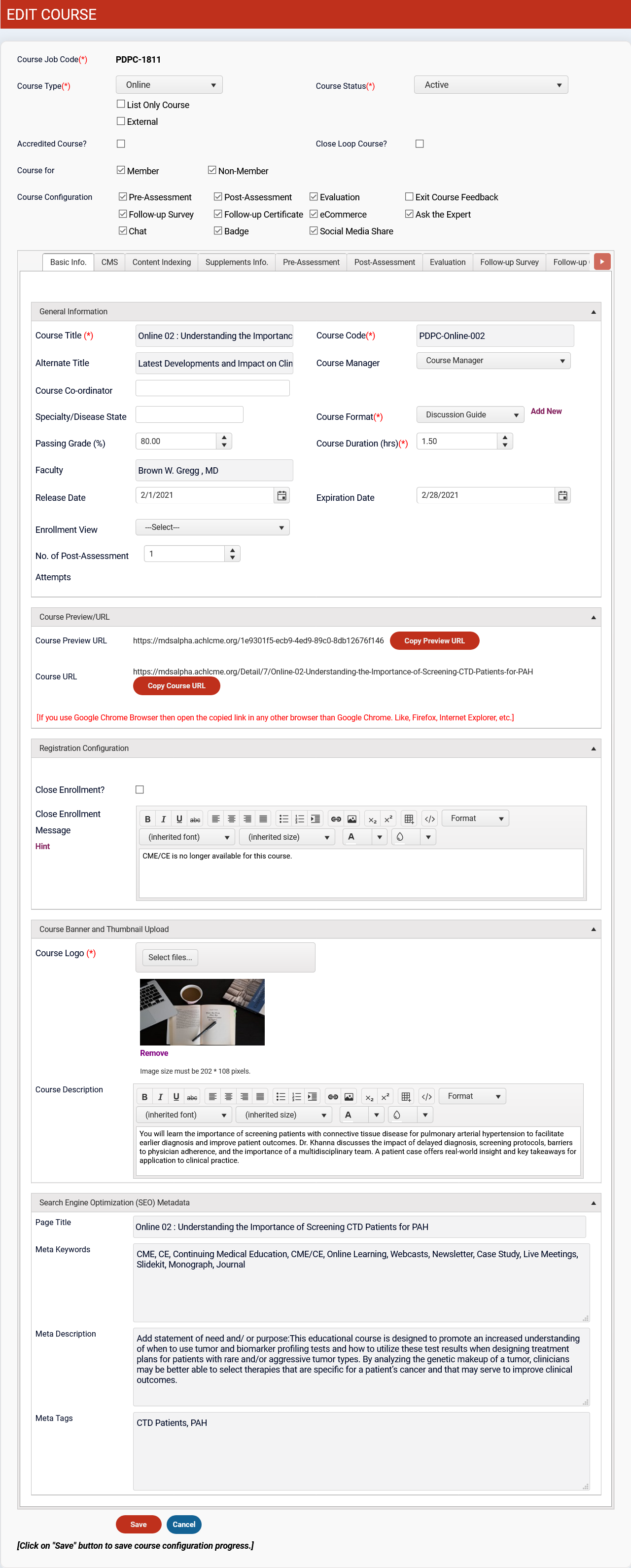 • Course Status: Current status of the course. For example, Preview, Active, Closed, Certificate Only