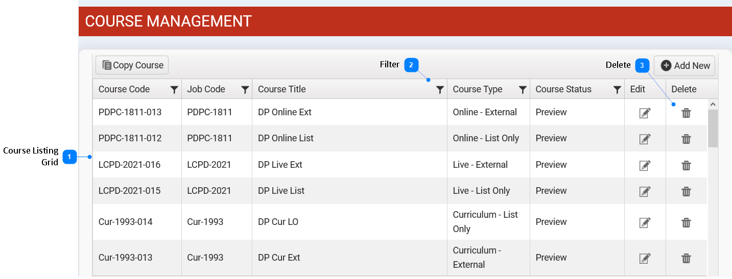 Administrative user is able to remove the online course by selecting the Delete option from the course listing grid.