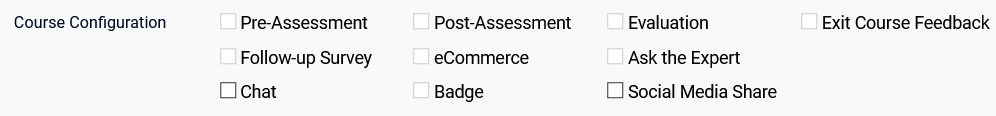 There are certain configuration settings involved for setting up the course. These configuration settings are grouped into different tabs based on course type. For example, Pre-Assessment, Post-Assessment, eCommerce, Badge, etc.