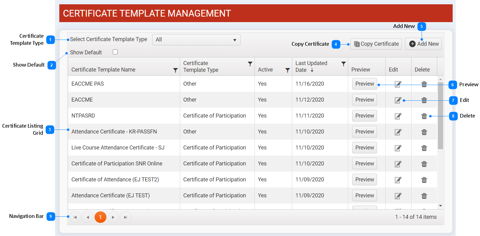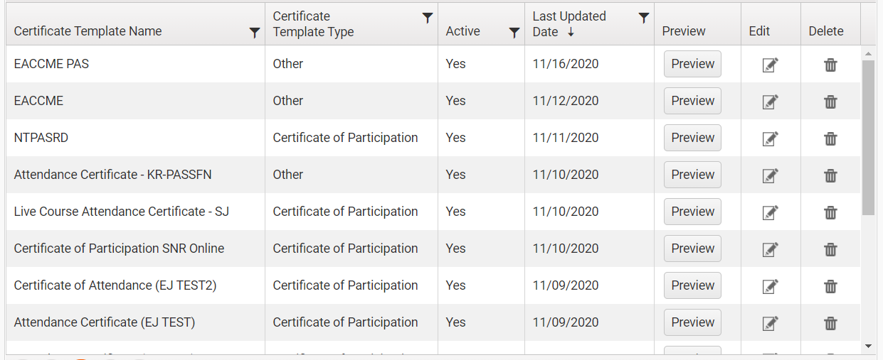 Certificate Listing grid list all defined certificates. It displays data like Certificate Template Name (Certificate), Certificate Template Type, whether or not the certificate is active(available to use for the course), Preview, Last Updated Date, Edit and Delete options. |