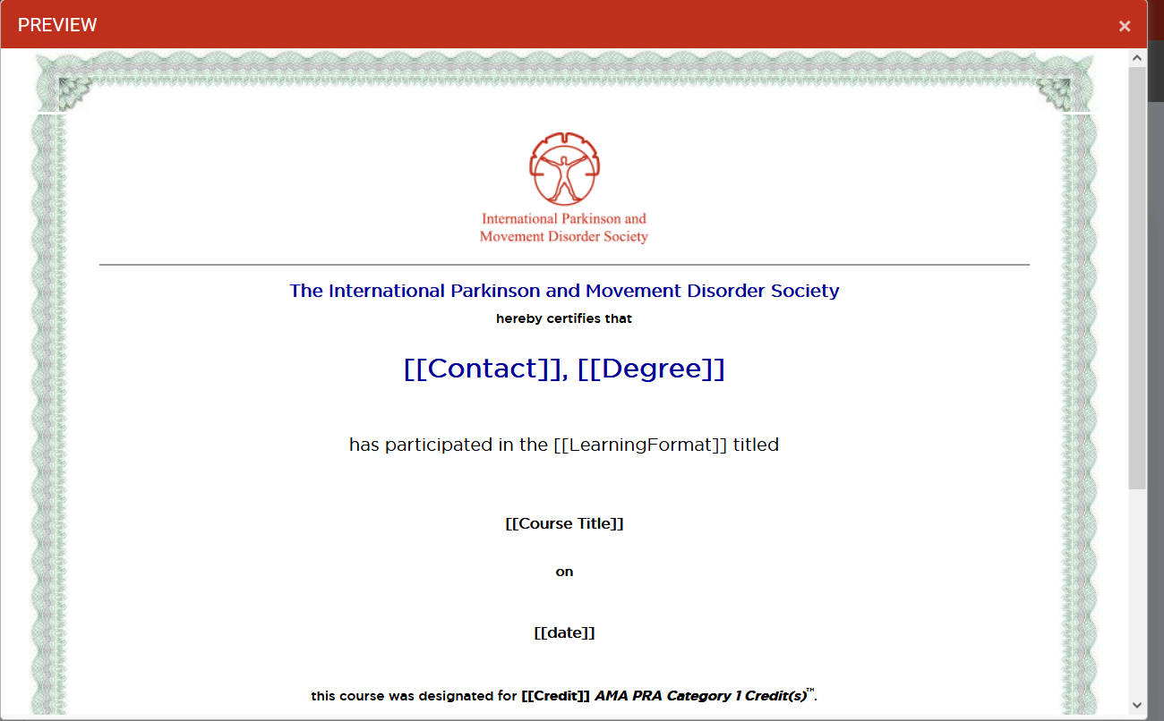 In preview certain data are shown enclosed with "[[" and "]]". For example, in screen shot below you can [[Contact]] and [[Degree]] and few others. These are tokens or placeholders which will be replaced with the actual values when certificate is generated to be sent to the learners.