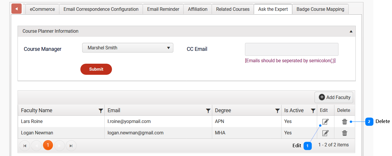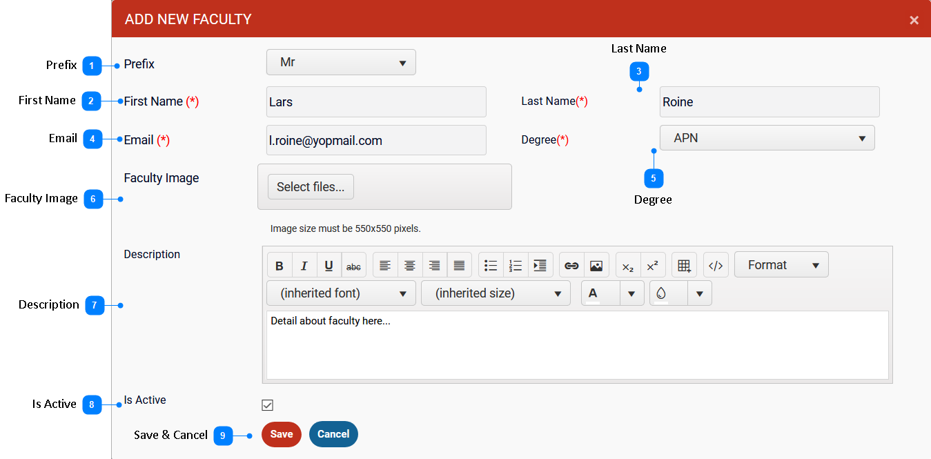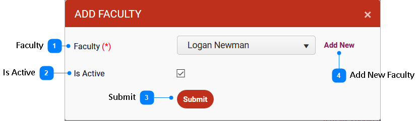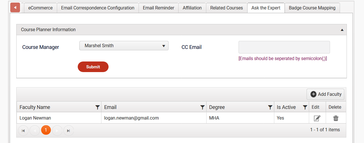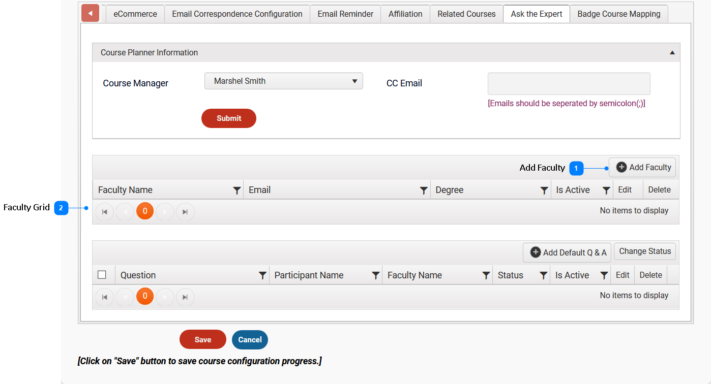 Click Save button to save the faculty record. The saved faculty will be available to be associated with the current course.
