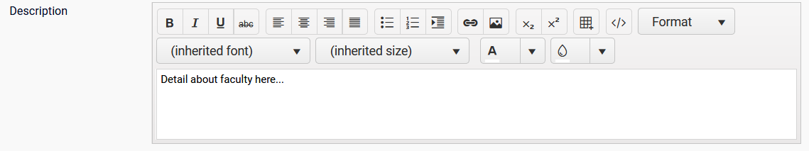 Enter require description about the faculty member. Use the Text Editor features to apply formatting to the content.
