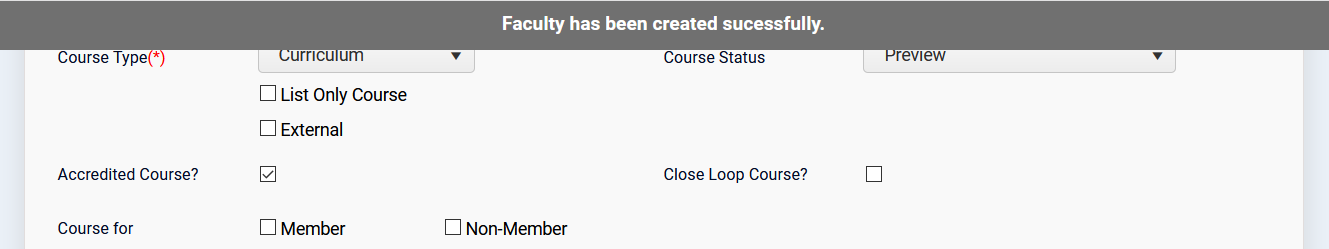 System displays message once record has been saved successfully and the newly associated faculty with the course will be listed in the faculty grid.