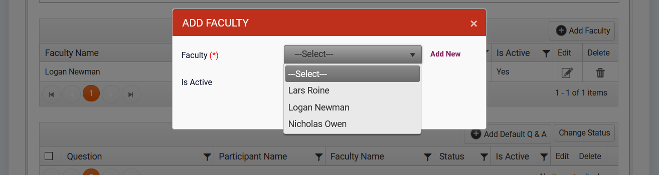 Check or uncheck check box to set the faculty active or inactive. Active faculties will be available to be associated with the course(s).