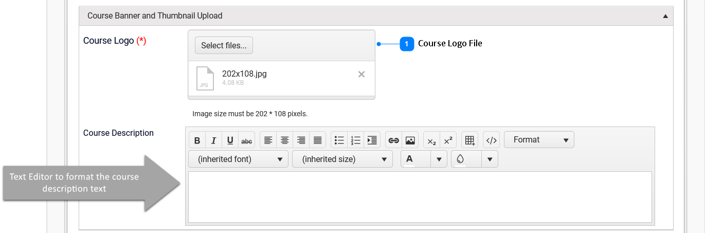 Upload appropriate logo/thumbnail for the course you want to display in the course catalog. Note: Image size must be 202 * 108 pixels.