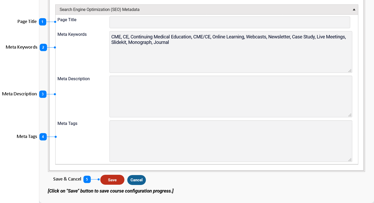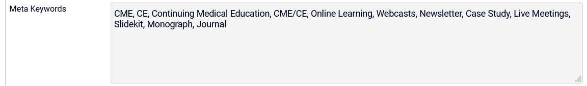 Define the meta keywords. This will be used for Search Engine Optimization (SEO). For example, you can define meta keywords like CME, CE, Continuing Medical Education, CME/CE for CME course.