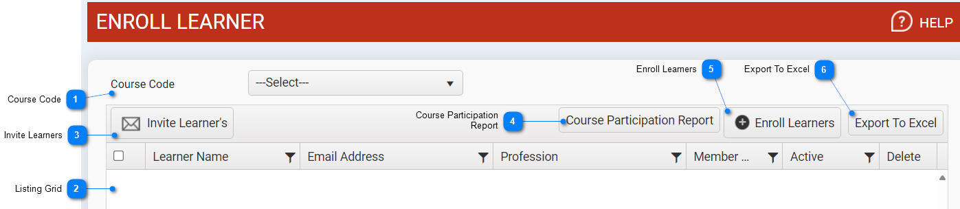 Select the course code from the drop down menu for which learner(s) details are required to be reviewed and/or enroll or invite learner(s). |