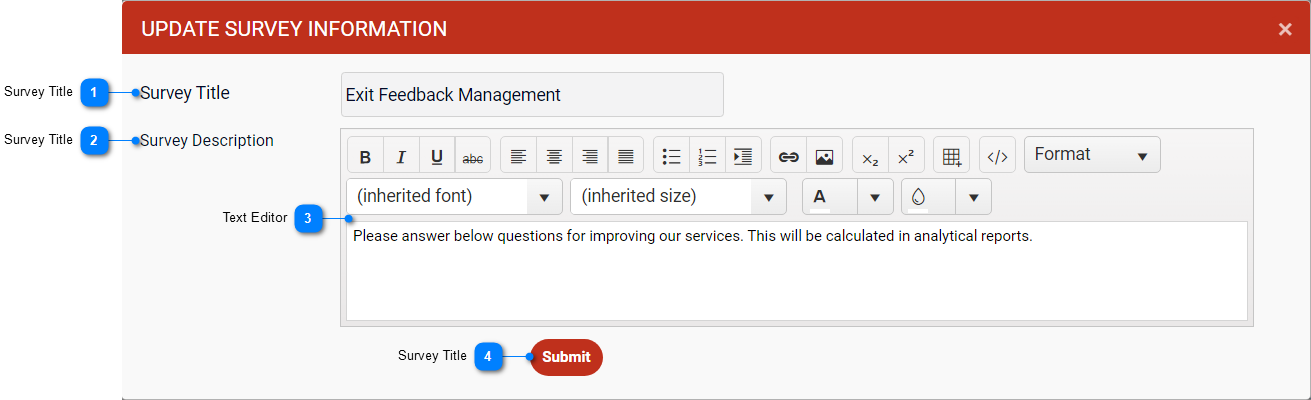 This section shows the Survey Title and the Survey Description defined to be displayed on the exit feedback page. |