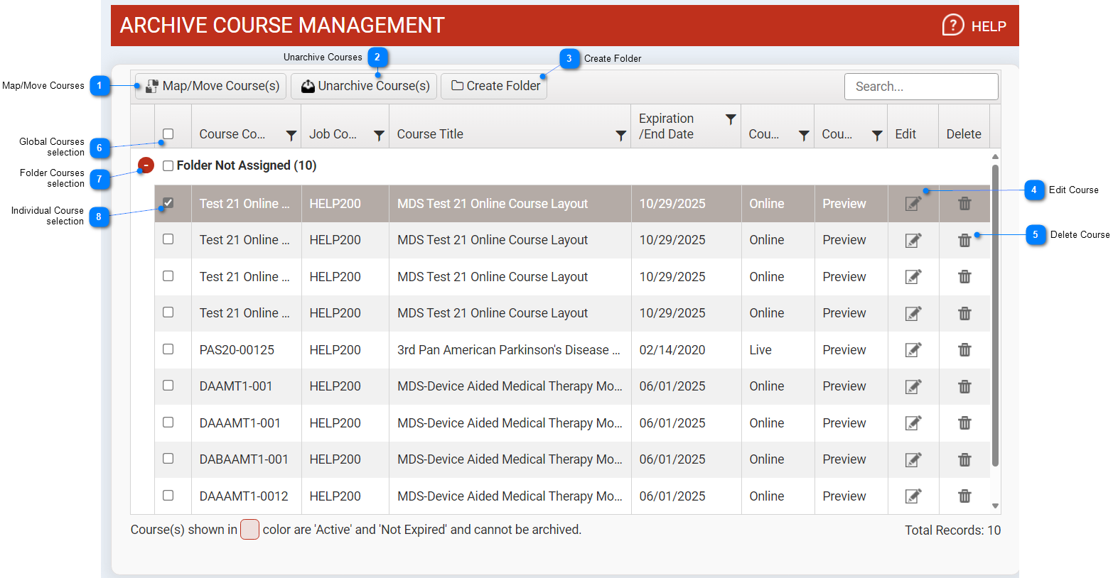 This feature allows administrative user to edit/delete a course and also Map/Move, Unarchive course(s).