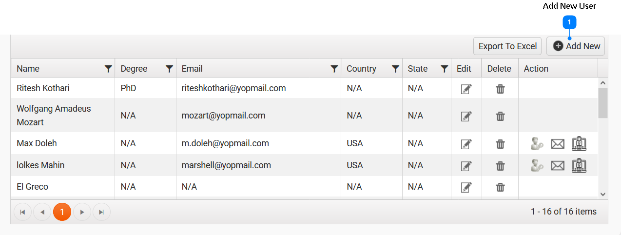 Selecting Add New option available on top right of User listing grid opens Add User interface: