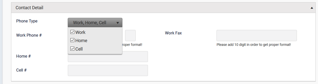 Select Phone Type from the drop down. Possible values for phone types are Work, Home and Cell. Select value(s) and enter respective phone no. values.