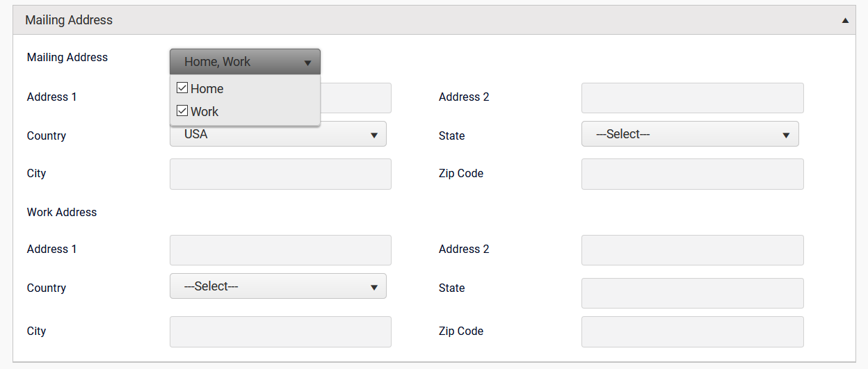 Select value(s) and enter respective values for Home and Work address data for Address 1 and Address 2, Country, State, City, and Zip Code.
