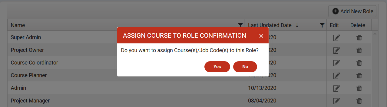 Once you submit/save the Role, system displays screen to Assign Job Code(s)/ Courses(s) to the newly created role.