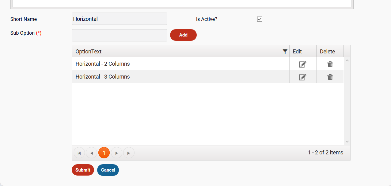 Click Submit button to save the changes made to option value record Or Cancel to cancel the changes made to the option value record. |