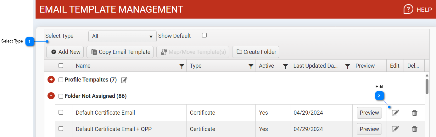 Select Email template type for which you want to list Email templates and edit Email template.